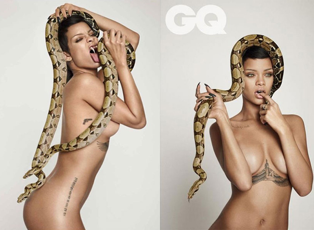 Never one to shy away from getting all nude-like in her music videos/most places, Rihanna joined the completely starkers brigade with a recent shoot for GQ magazine, appearing with nought but a large snake as clothing. Channelling the mythical Greek monster Medusa, Rih and her perfectly placed boa grace the cover of the 25th Anniversary edition and, depending on your level of Ophidiophobia (fear of snakes), is either sexy as hell or NOOOOOOOPE.